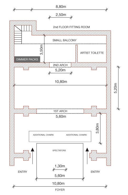 Larghezza palcoscenico: 10,80m ; Profondità palcoscenico: 8,50m + 3,50m